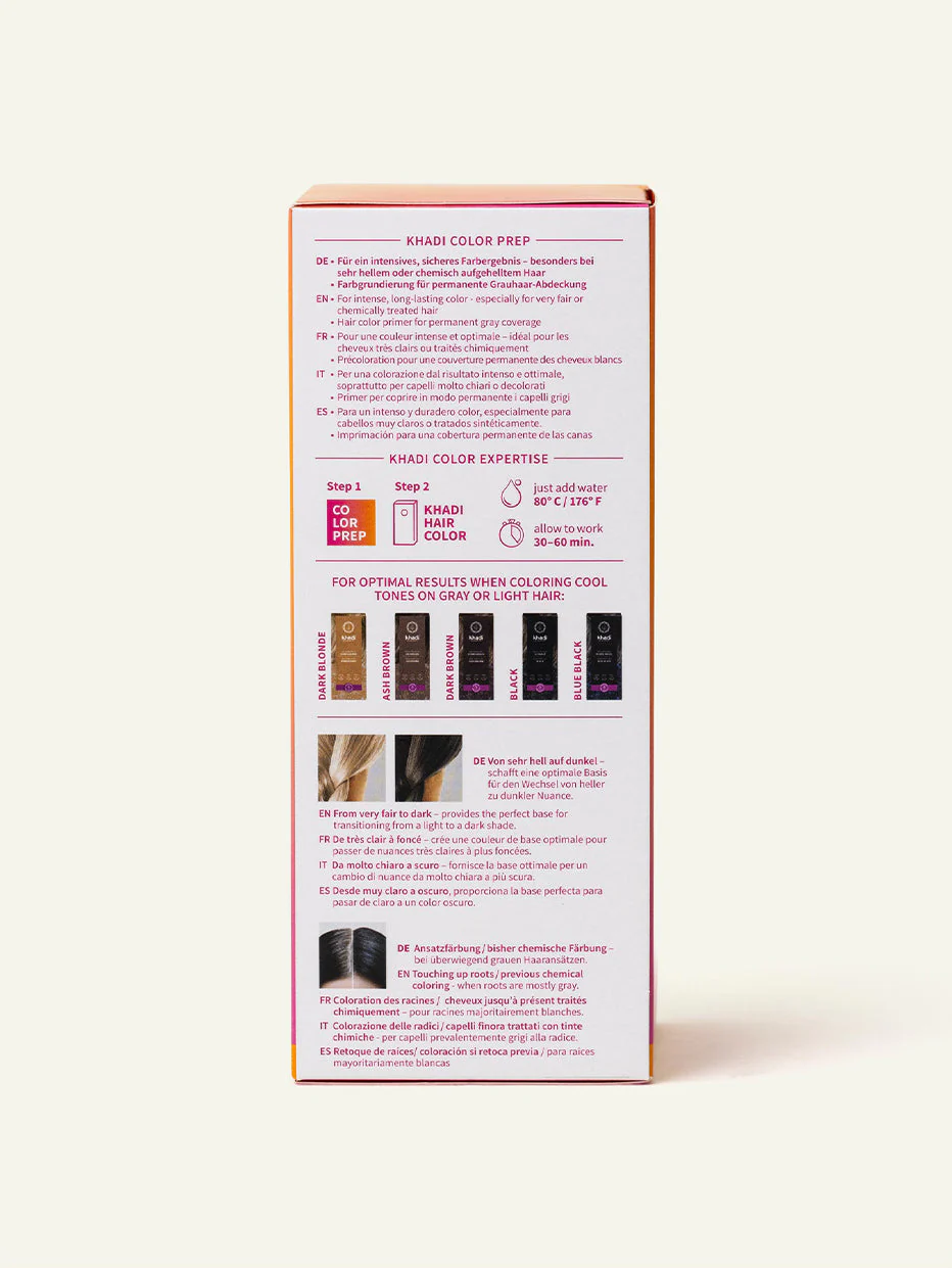 Utilisez Color Prep khadi uniquement en combinaison avec l’une des nuances pour lesquelles il est recommandé : Blond Foncé, Châtain Cendré, Brun Foncé, Noir, Indigo.