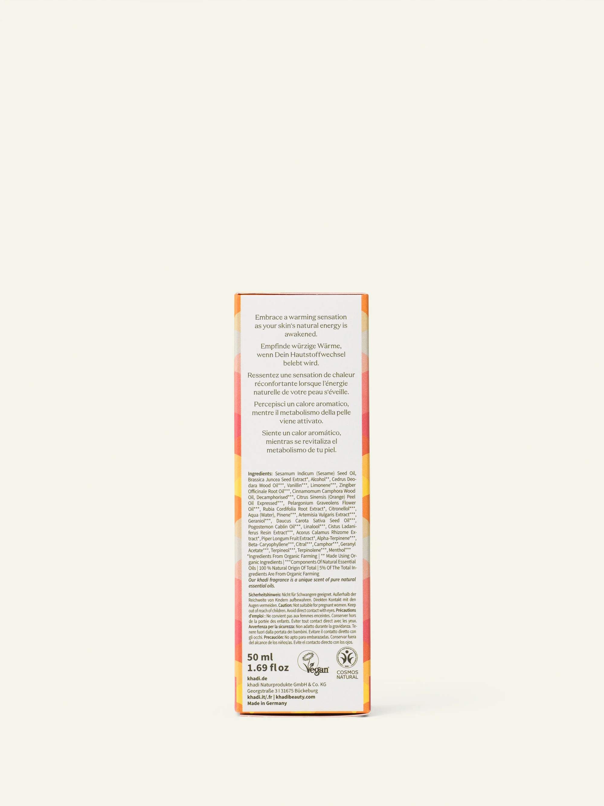 La concentration de l’ÉLIXIR KHADI SPICY CELL-LITE dans cette huile corporelle atteint jusqu’à 20 %, contre seulement 2 à 5 % dans les huiles classiques de cosmétique naturelle.